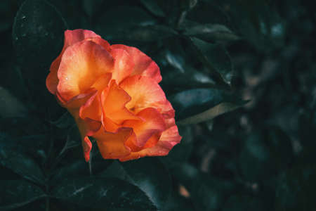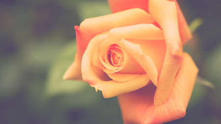 Orange rose over blurred flower garden background, nature concept background, vintage tone style