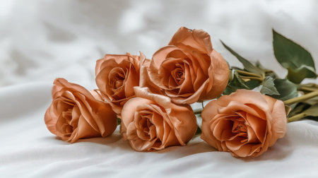 A stunning display of soft peach roses on a smooth white surface, embodying elegance and beauty, ideal for wedding themes or romantic decor inspiration.
