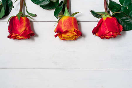 three red and yellow roses on a light wooden background with copy space. layout for design