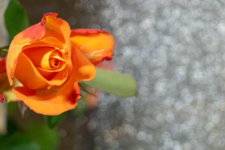 A single orange rose on a dark background, with blank space on the left for text or logos.