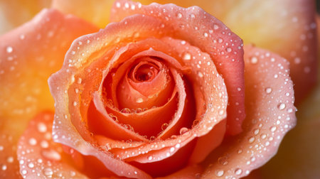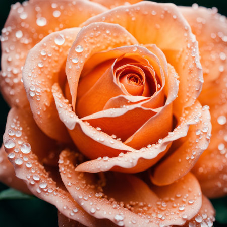 A stunning close-up of a peach rose petal adorned with glistening water drops. This image captures the beauty and delicate texture of nature's flower, symbolizing romance and freshness.