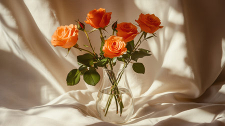 A stunning arrangement of freshly cut orange roses in a clear glass vase sits gracefully on a soft fabric background, illuminated by natural light, creating a serene atmosphere.