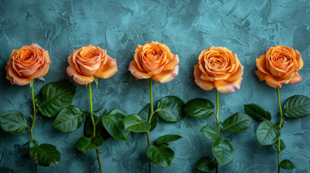 Five beautiful peach roses are lined up with green leaves against a blue backdrop.