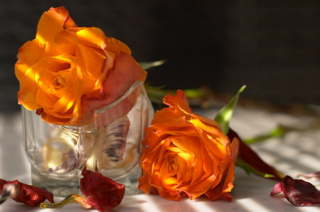 Moody Floral background with red and orange roses on dark background with copy space, floral design, selected focus.