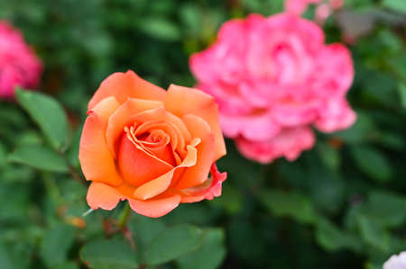 Close-up of a vivid Hybrid tea rose with apricot color petals blooming in a garden