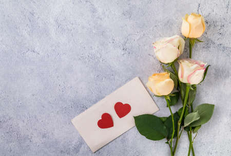 red roses, gypsophila, an envelope, and hearts on a light background, a minimalist modern composition for a Valentine's Day concept, providing ample empty space for text or invitations