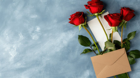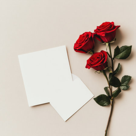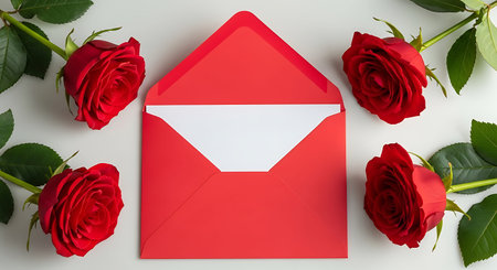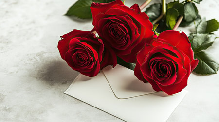 Close-up of vibrant red roses resting on a blank white envelope, highlighting petals and natural texture, perfect for romantic and Valentine's Day concepts