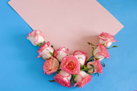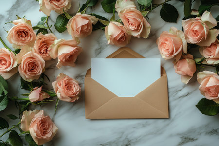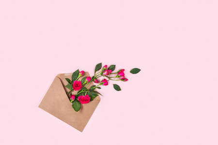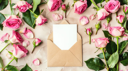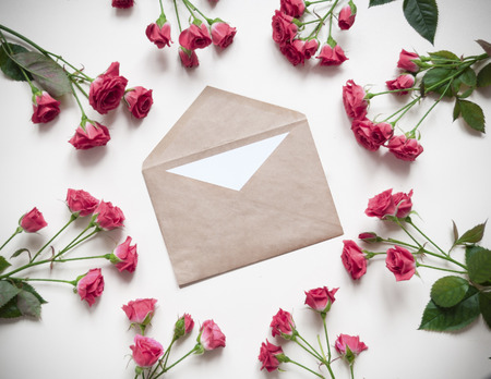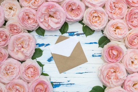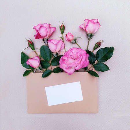 Envelop with white card and rose background. Top view., Envelope with flowers summer, spring