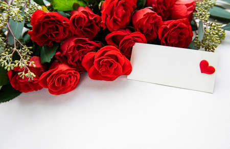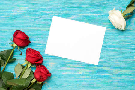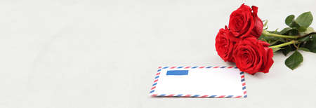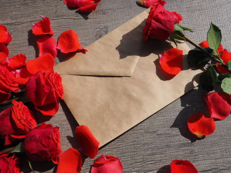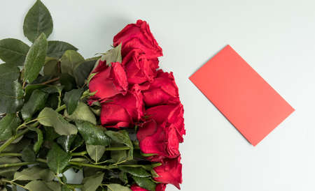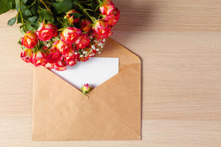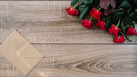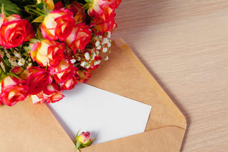 Bouquet of red roses on a wooden table with an envelope and a blank paper card for your text, concept prazniki