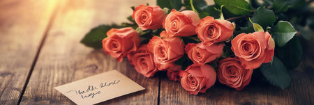 A delicate bouquet of orange roses rests on a rustic wooden table, accompanied by a small handwritten note for someone special.