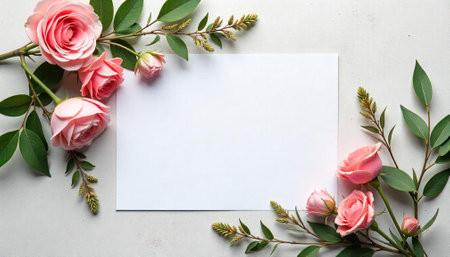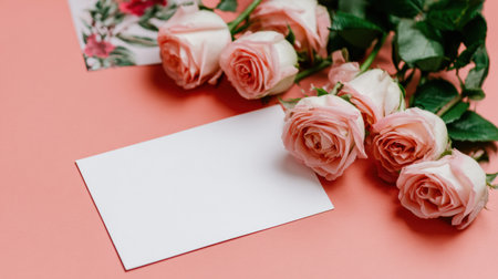 A clean white vertical greeting card rests on a pastel pink table, surrounded by blurred roses that create a romantic atmosphere.