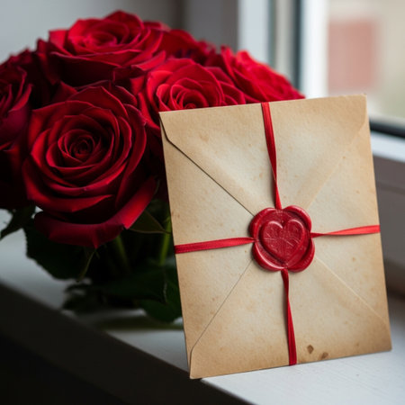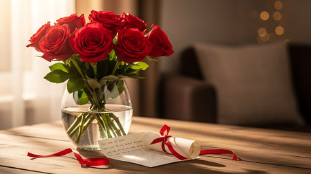 Bouquet of red roses in vase. Handwritten love letter with red ribbon on wooden table. Romantic gesture in sunlit room. Valentine's day message, anniversary surprise. Thoughtful gift, home decor, personal touch, heartfelt sentiment. Affectionate words.