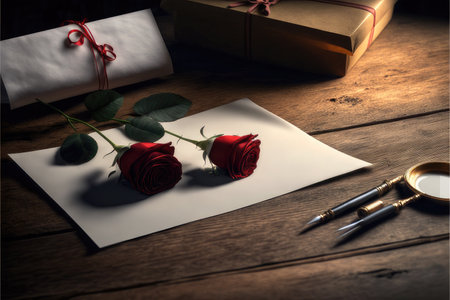 Experience the romance of a beautifully set table with red roses, blank paper, and cinematic lighting. Perfect for Valentine's Day or a special evening, this image captures an atmosphere of love and elegance.