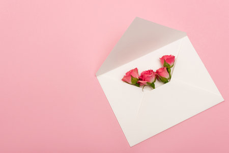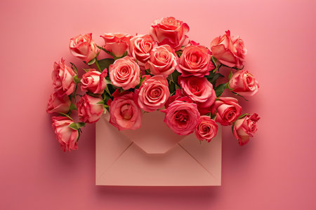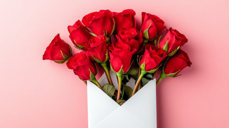 Red roses in a white envelope on pastel pink background, minimalist style, generative ai