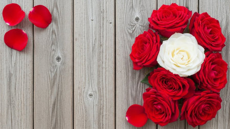 Romantic floral arrangement, fresh red roses, single white rose, natural wood texture, Valentine's Day, anniversary gift, love.