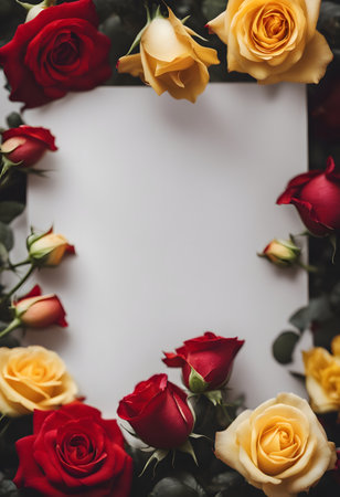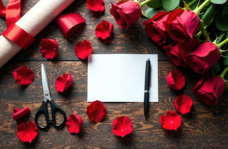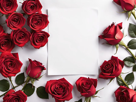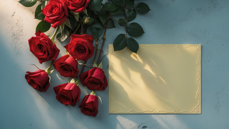 A beautifully arranged set of red roses surrounds a blank card, ideal for expressing romantic feelings. Generative AI