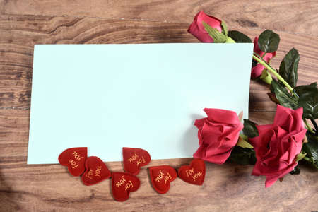 Red roses and blank piece of paper on wooden board, valentines day background, wedding day