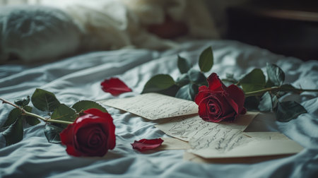 Broken roses and shredded love letters on an empty bed, capturing the essence of heartbreak and the pain of lost affection