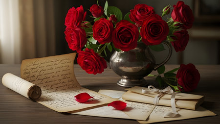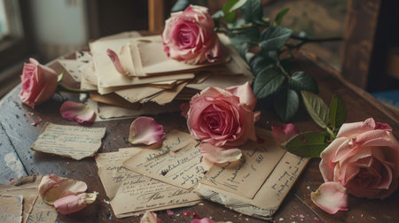 Romantic reflections: Vintage love letters and roses together, symbolizing a nostalgic look at love stories and cherished memories