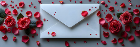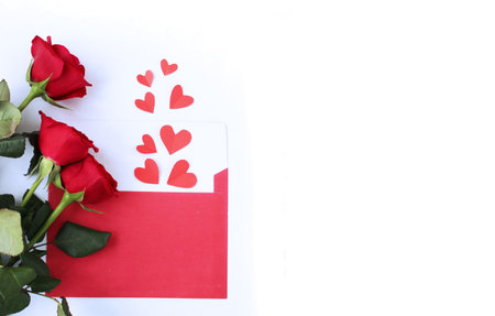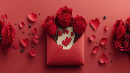 A beautiful top-down view of a red envelope filled with red roses and a love note adorned with hearts. Scattered petals create a romantic Valentines Day or anniversary scene.