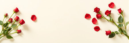 Elegant red roses with green stems on cream textured background, beauty. generated by ai