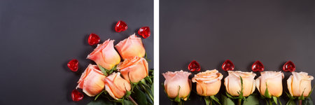 Mother's day. Women's day. Valentine's day, Birthday background. Fresh roses. Spring flat lay, top view