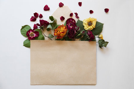 Flat lay composition with beautiful dried flowers in envelope on white background