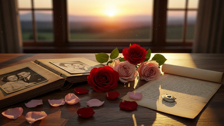 A collection of red and pink roses is artfully arranged on an open book and a handwritten letter. Several vintage photographs, including one in a framed album and another loose, are placed on the wooden table, alongside a small locket. The scene is illuminated by the warm glow of a sunset visible through a large window, which also reveals a distant landscape. The overall impression is one of romantic nostalgia and the preservation of cherished memories.