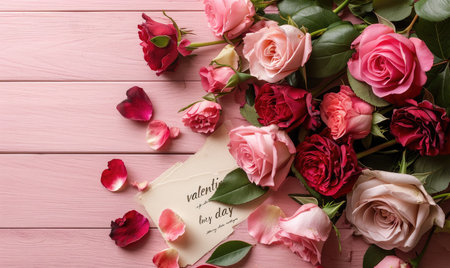 A delicate arrangement of pink roses beside a handwritten note captures a warm and intimate moment, perfect for conveying love and romance.