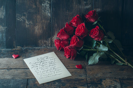 A charming bouquet of fresh red roses rests on a rustic wooden table, accompanied by a handwritten note, embodying love and affection for special occasions.