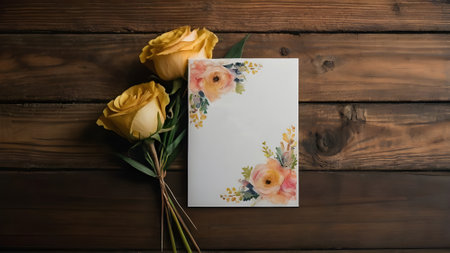 Beautiful rose paper card with gift card on wooden background . Generative AI