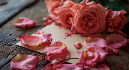 Delicate coral roses with lush green leaves create a romantic scene on a rustic wooden table, placed near a simple envelope
