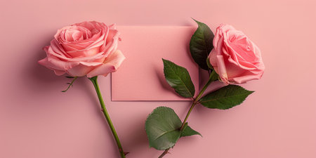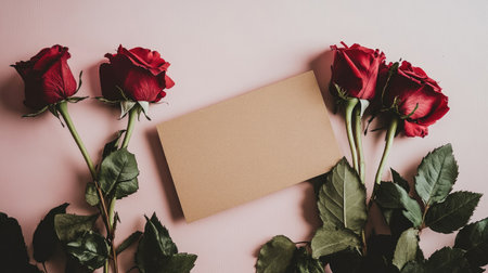 A stunning display of red roses next to a blank kraft paper card, set against a soft pink background, ideal for romantic gestures, love notes, and special messages.