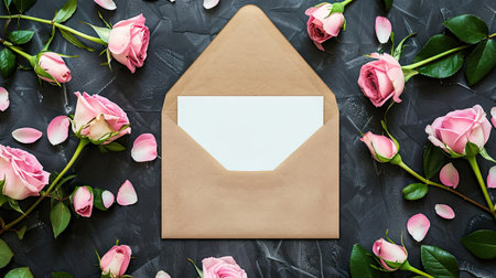 A delicate envelope sits surrounded by a vibrant display of pink roses, symbolizing love and thoughtfulness.