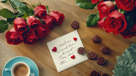 A beautifully arranged scene featuring red roses, heart-shaped chocolates, and a handwritten love note on a wooden table, exuding romance and warmth.