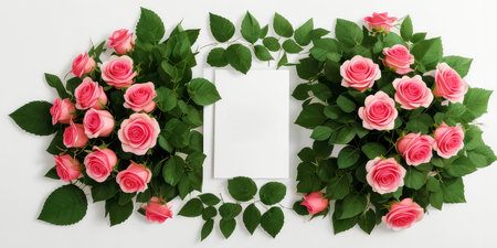 A delicate envelope surrounded by a circle of vibrant pink roses, creating a beautiful and romantic setting.
