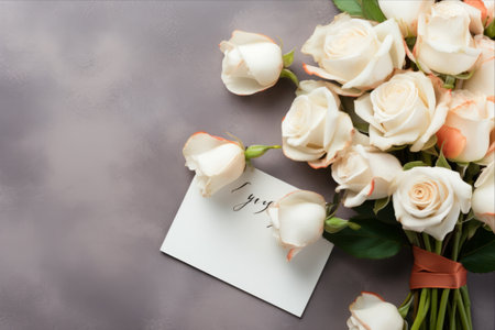 A bouquet of beautiful roses with soft petals is elegantly placed on a rustic wooden table, complemented by a handwritten note.