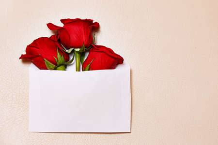 Three red roses arranged diagonally on a white envelope, creating a simple and elegant composition for love letters or greeting card concepts