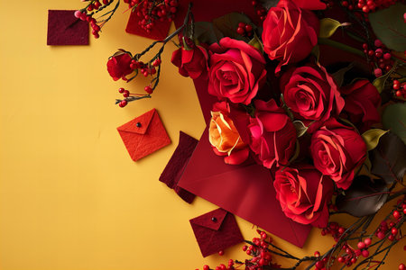 Oodoo red envelopes, bouquet of red roses and chinese red envelopes on a yellow background