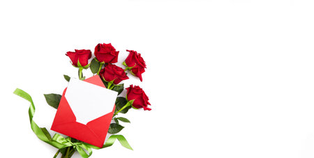 A bouquet of red roses, a red envelope with an empty piece of paper