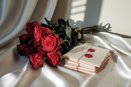 Bouquet of red roses lying on white silk with handwritten letters and wax seal