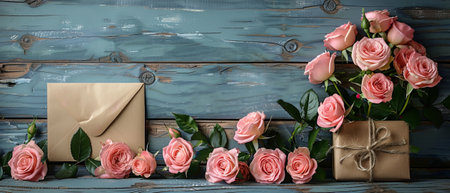On top of a shabby wooden plank background, pink roses are accompanied with an envelope, card with greeting text, and gift box. Flat design.
