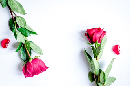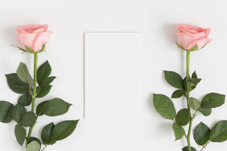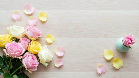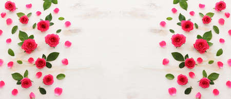 Rose composition on the colored background. Overhead top view, flat lay. Copy space. Birthday, Mother's, Valentines, Women's, Wedding Day concept.