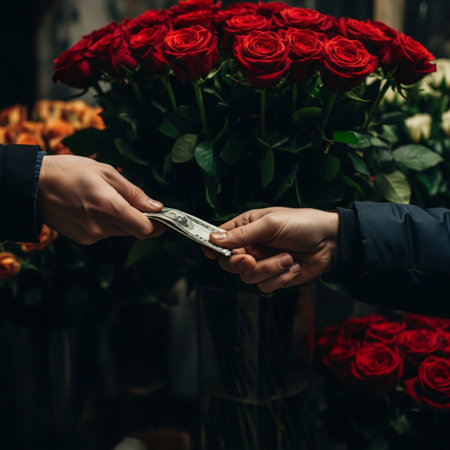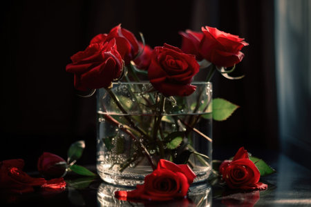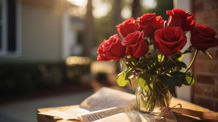A beautiful bouquet of red roses in a clear vase sits on a rustic wooden table. Scattered around are rose petals, a small box of chocolates, and a card with a wax seal. The scene is set for a romantic occasion, likely a celebration of love or an intimate gesture.