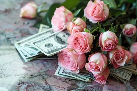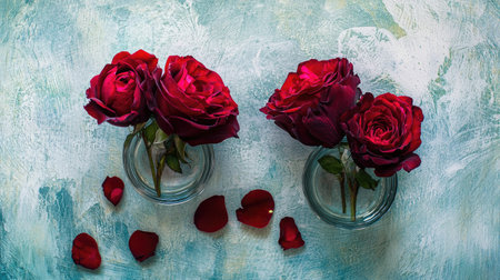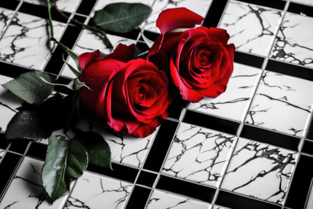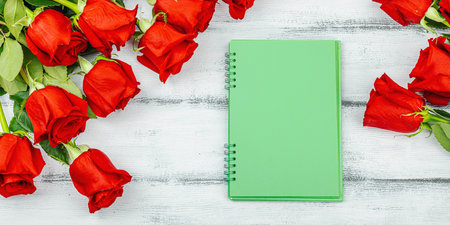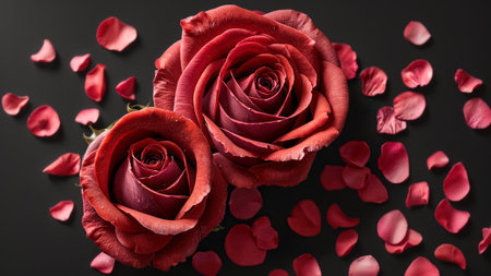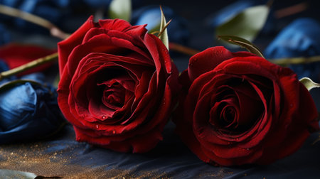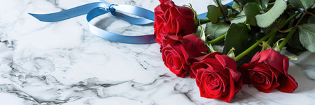 Romantic flat lay of red roses with luxurious velvet ribbon capturing elegance and beauty