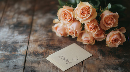 A delicate bouquet of orange roses rests on a rustic wooden table, accompanied by a small handwritten note for someone special.