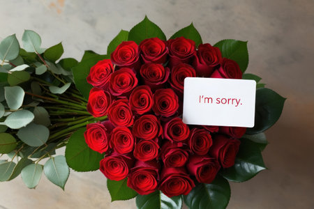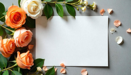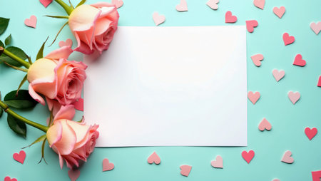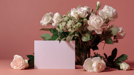 A beautifully arranged set of red roses surrounds a blank card, ideal for expressing romantic feelings. Generative AI