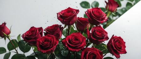 Close-up of a bouquet of vibrant red roses adorned with water droplets, surrounded by lush green leaves. Captured against a clean white background.