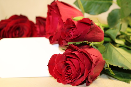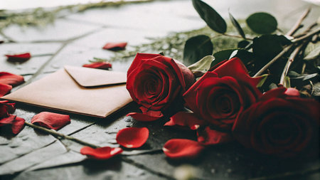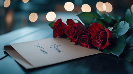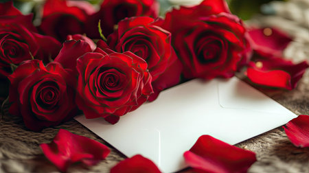 Close-up of vibrant red roses resting on a blank white envelope, highlighting petals and natural texture, perfect for romantic and Valentine's Day concepts