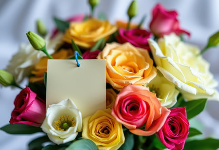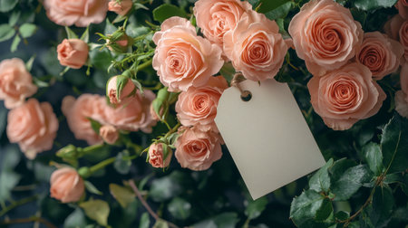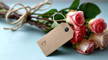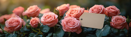 This image showcases a lovely bouquet of pink roses adorned with a blank tag, perfect for conveying heartfelt messages on special occasions.